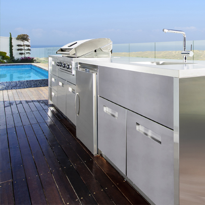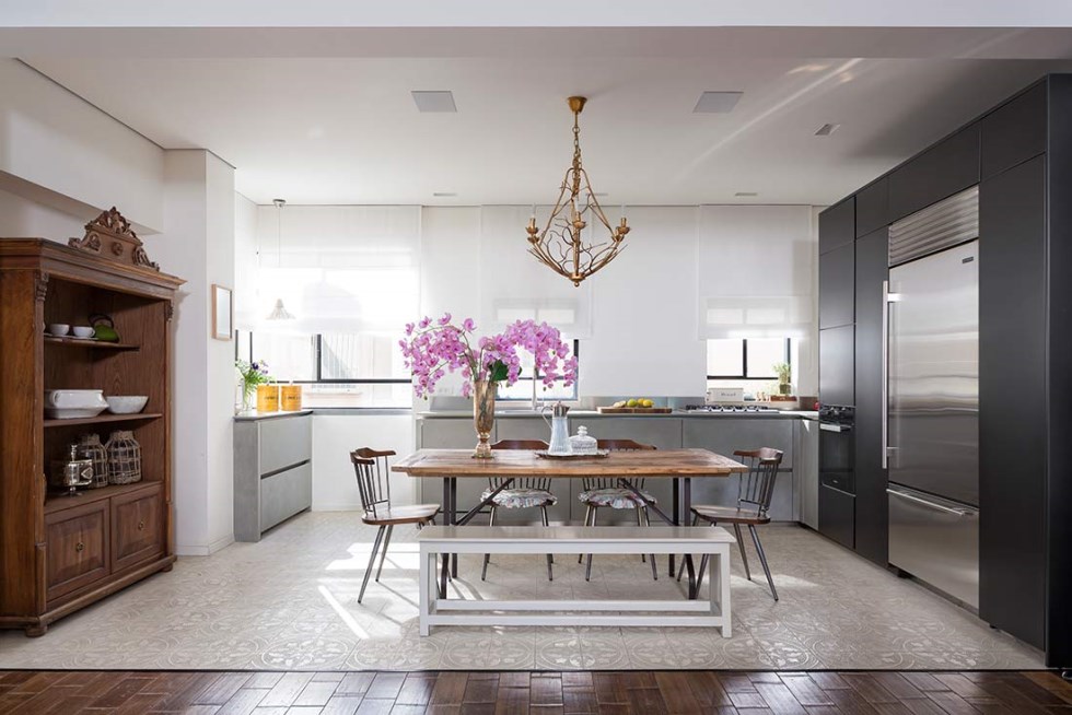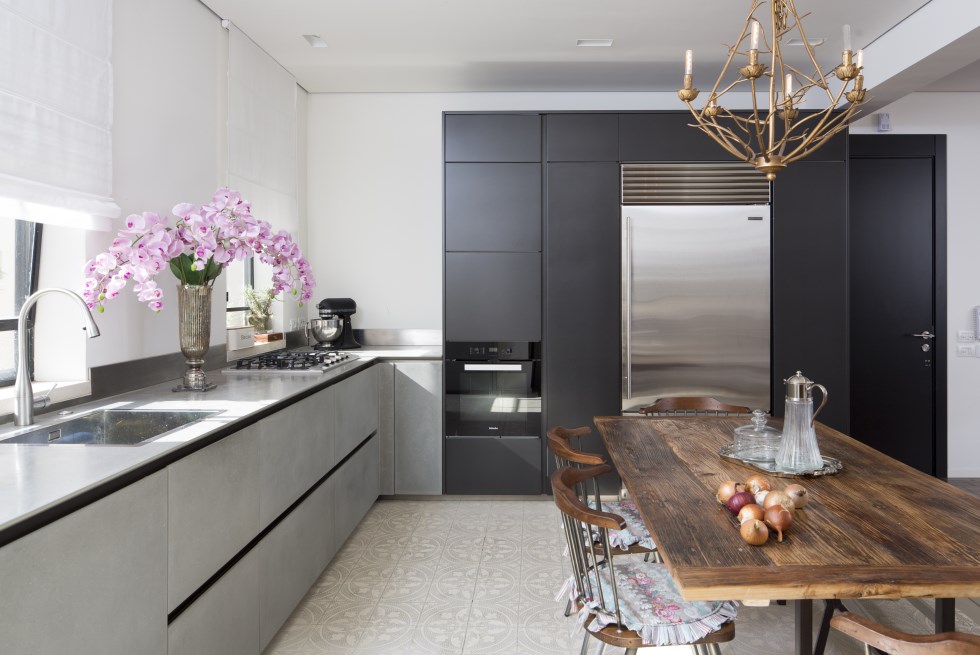 המטבח חופה אף הוא באריחי גלוסקא בגוון שמנת, אשר מהווים קונטרסט עיצובי לחזיתות הבטון של הארונות התחתונים, מעליהם משטח עבודה משיש, וכן לארונות הגבוהים הצבועים בשחור. במקום אי ישיבה מסורתי, נבחר שולחן עץ וסביבו כיסאות במראה נוסטלגי לשמש כמקום להתכנסות ולארוחות משפחתיות משותפות. ארון ישן, מציאה שהתגלתה ברחובות תל אביב, שופץ והפך למזווה ולארון תצוגה חינני, בצד המטבח, בגומחה שהיתה סוג של אילוץ קונסטרוקטיבי והפכה לרבת-חן.