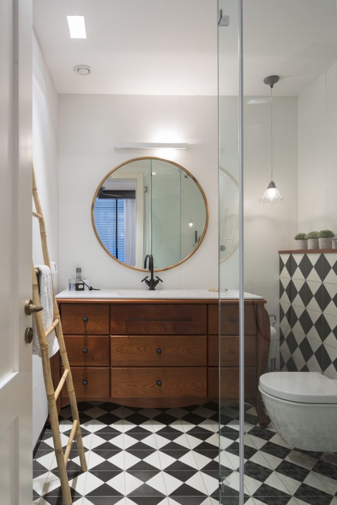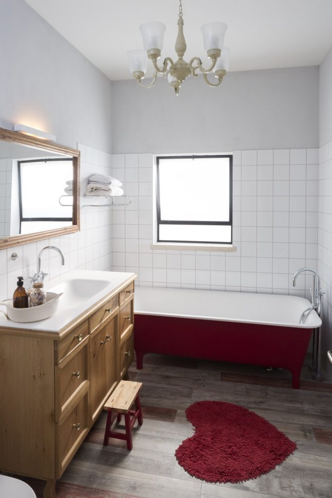במקום חדרי המקלחות וחדרי השירות של הדירות הישנות, תוכננו חדרי הבנות מחדש. החלונות שנפתחו להגדלת האור והמרחב בחלל חשפו נוף לא אסתטי של מזגנים, אשר הוסתר בחינניות בעזרת משרבייה. זו נצבעה בגוון חלודה הזהה לגוון הקורה התומכת לאורך הדירה כולה, ועליה צמח מטפס ופרחוני, שעתיד להסתיר את החלקים הלא פוטוגניים בנוף שבחוץ. חדר הרחצה של הבנות אובזר באמבטיה עומדת בצבע אדום ועז, וחופה באריחים דמויי עץ בסגנון שאבי-שיק. ארון אחסון מעץ משלב בין סגנון מיושן וכפרי לבין מראה מודרני, הודות למשטח קוריאן בוהק.