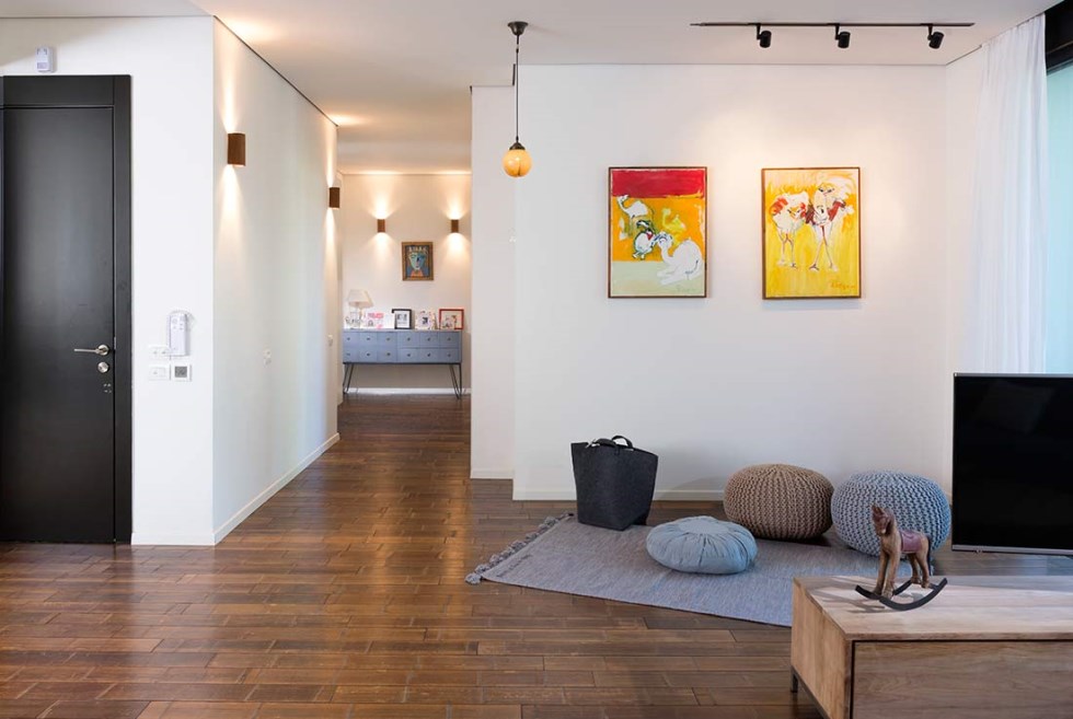 החלל המרכזי חופה בפרקט במבוק, דבר שהעניק לדירה תחושת חמימות מיידית. כבר מפתח הכניסה אפשר להתרשם מהאיזורים הציבוריים, הכוללים את המטבח, פינת האוכל, הסלון, ופינת המשפחה.