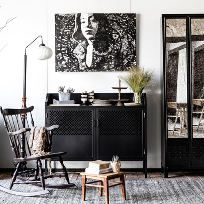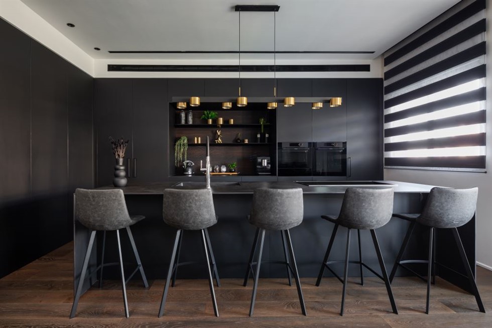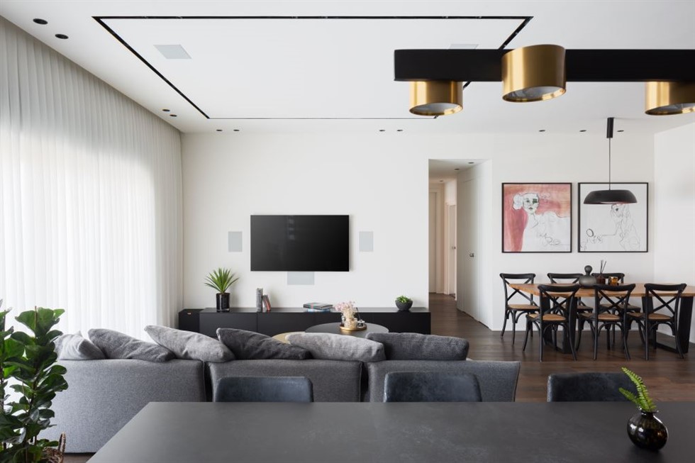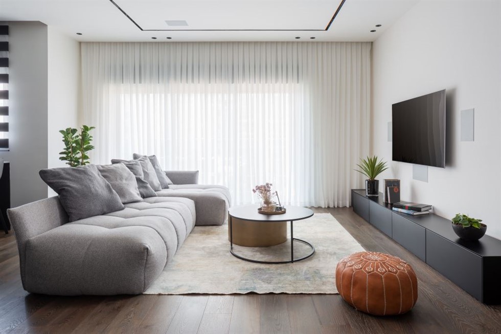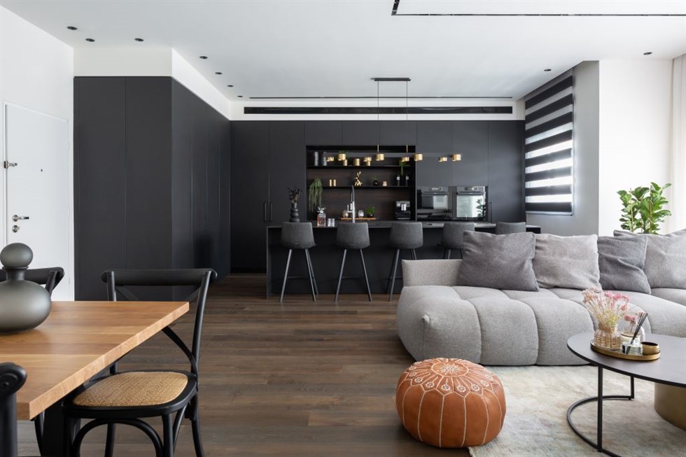 בסלון המואר בחר לסלב פינת ישיבה עמוקה, פופית מפונקת ומעוגלת לה שידך הדום אקלקטי עשוי עור שמשמש בעיקר כפריט נוי. "בחרתי לשלב מספר אלמנטים שהם יותר כפריים", הוא מסביר. "הם שוברים את המסה הישרה ומכניסים אופי לחללים". את רהיט המולטימדיה הארוך, שבשל אורכו בנוי שתי יחידות נפרדות בחר לעטוף בפלטת מתכת היקפית שמקנה לו מראה של יחידה אחת. את החזיתות בחר לצבוע בתנור בגוון כהה שמתכתב עם הארון בכניסה וחזיתות המטבח הצמוד.