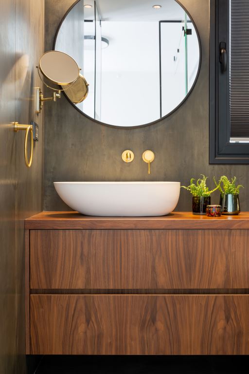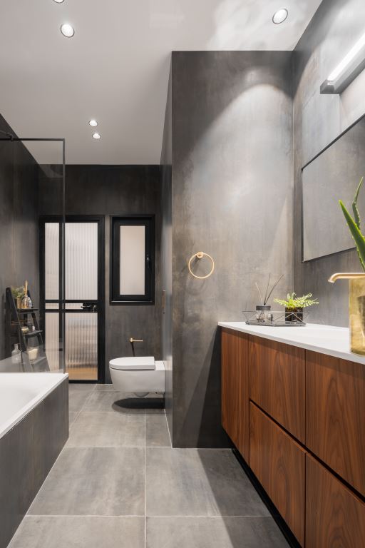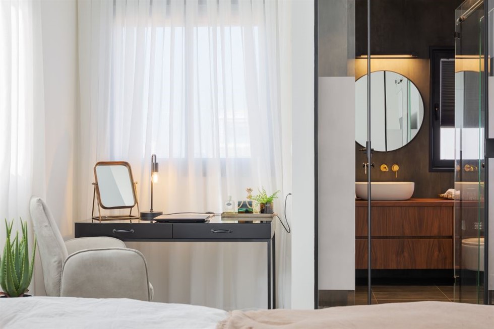 "בחדר הרחצה של בני הזוג הלכתי על קו יותר אורבני. כך למשל את הרצפה והקירות חיפיתי בפלטות פורצלן מדוקקות גדולות מיוחד בגווני מתכת, הברזים שנובעים מהקיר הם בגימור פליז וארון האמבט, אותו תכננתי מעץ אגוז אמריקאי מכניס נראות טבעית" מסביר המעצב. "לבני הזוג חשוב היה לקבל חדר רחצה שמשדר ספא. תכננתי עבורם מקלחון זוגי על ספסל נשלף וג'טים מתוחכמים במיוחד. החציצה בינו לבין חדר הרחצה היא שקופה אך למען הצניעות בחרתי לעצב חלקים ממנה בזכוכית חלבית".