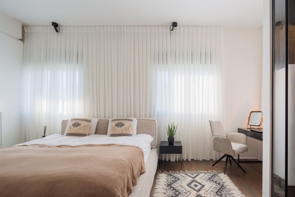 חדר השינה עתיר בפריטים שמכניסים לו שפע של רוך: "לי הוא מאוד מזכיר בית מלון בוטיק יווני בעיקר בגלל השילוב של חומרים טבעיים ושימוש בצבעי אדמה מדבריים", מסביר המעצב. "הכנסנו מוטיבים עם דוגמאות אקלקטיות בגוון נעימים כמו שטיח הצמר וכיסוי הכריות. החומרים איתם עבדתי, כמו בד, פשתן ועץ, מוסיפים חמימות ורכות".